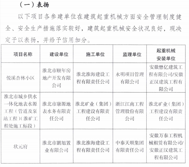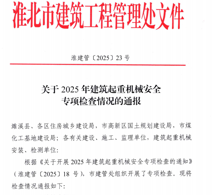 2025年7月21日,淮北市建筑工程管理處發(fā)布了2025年建筑起重機械安全專項檢查情況通報,淮海建工公司承建的悅溪杏林小區(qū)、狀元府兩個項目在安全管理制度健全、安全生產(chǎn)措施落實及建筑起重機械安全狀況良好等方面表現(xiàn)突出,獲得市建管處通報表揚的同時也為公司贏得了信用加分!