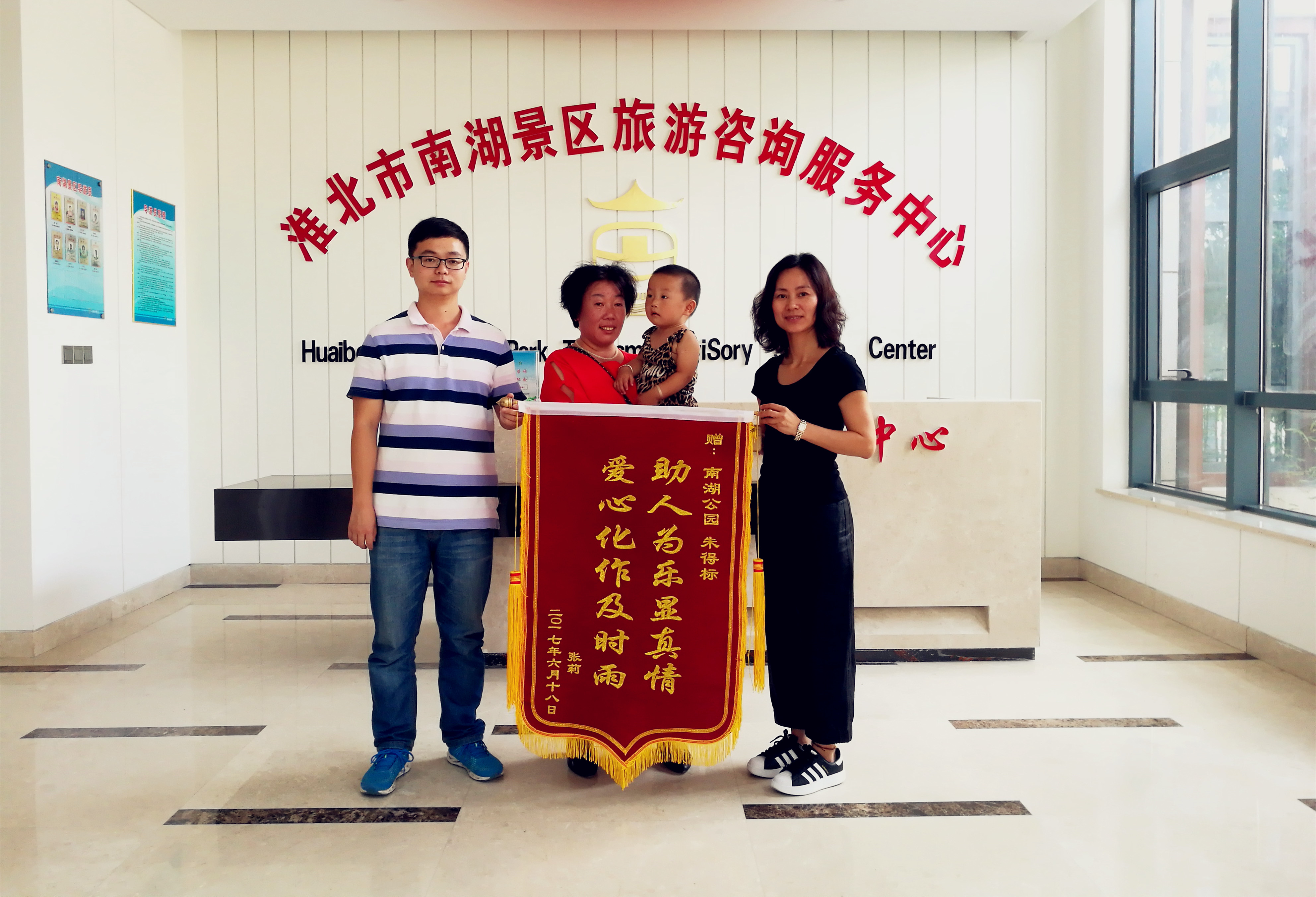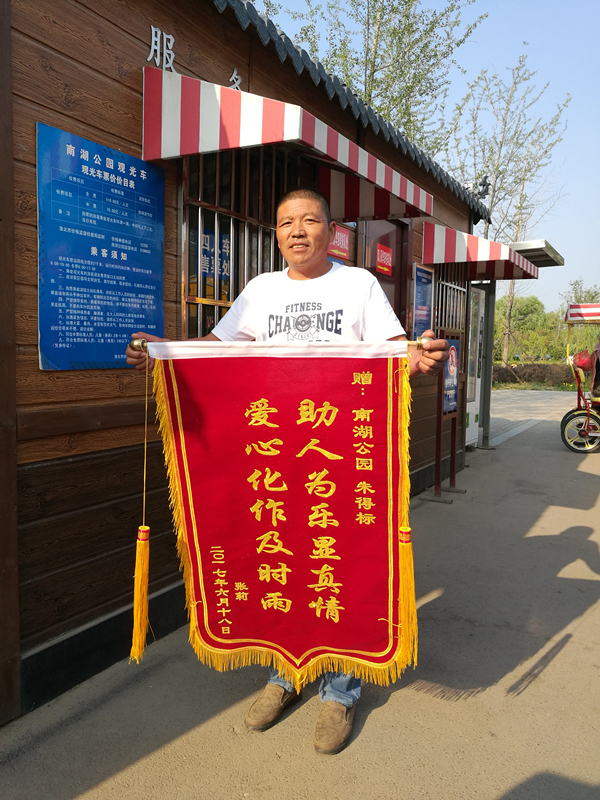 在朱班長和景區(qū)工作人員的共同努力下,于在當(dāng)天下午聯(lián)系到了失主張女士,并將她丟失的背包轉(zhuǎn)交給了她本人。看著失而復(fù)得的背包,張女士十分感動。6月26日上午張女士再次來到南湖景區(qū)游客服務(wù)中心,向景區(qū)員工以及拾金不昧的朱班長分別表示了感謝,并向拾金不昧的朱班長送來了錦旗。