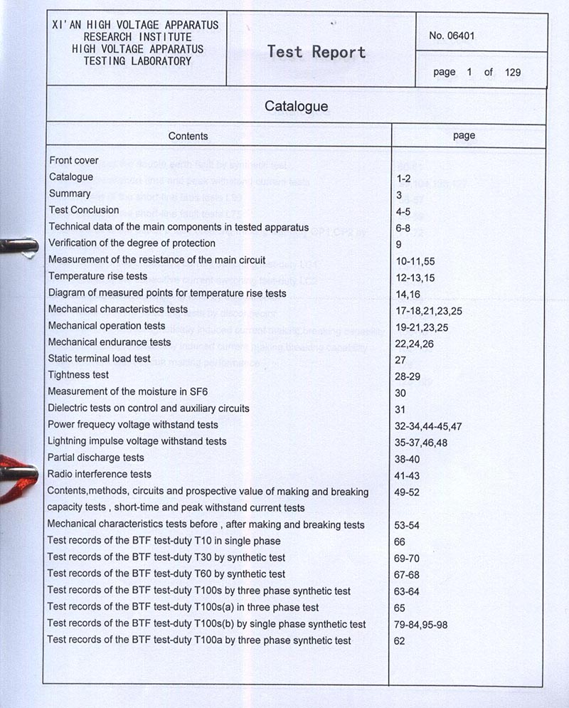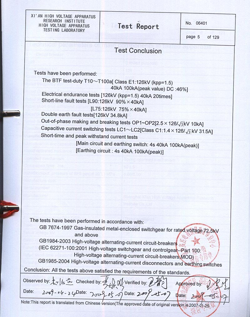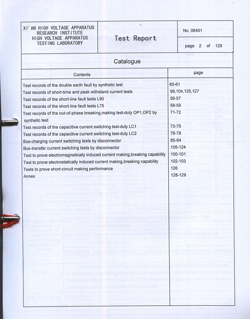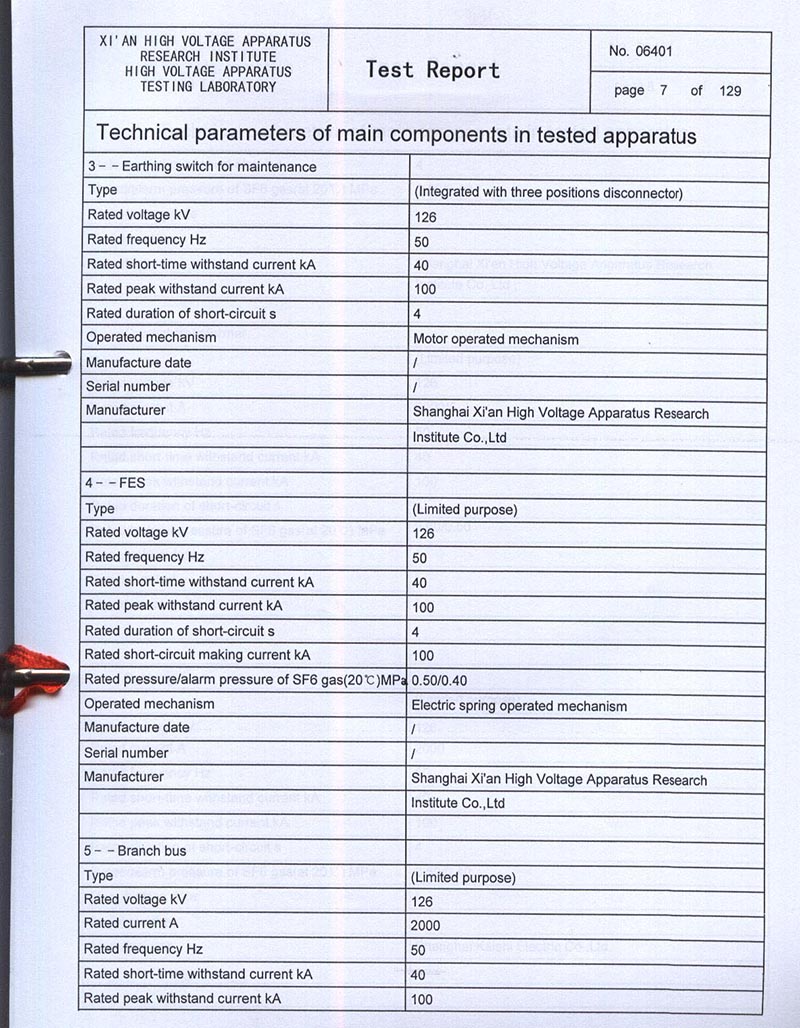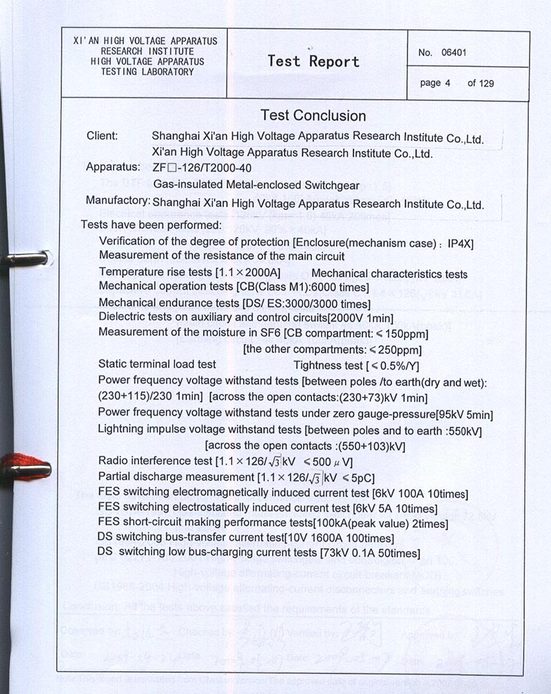 ZF-126T2000-40 GAS-INSULATED METAL-ENCLOSED SWITCHGEAR TEST REPORT