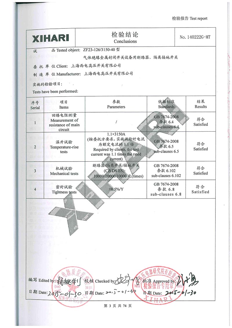 ZF23-126T3150-40型氣體絕緣金屬封閉開關(guān)設(shè)備用斷路器、隔離接地開關(guān)檢驗報告